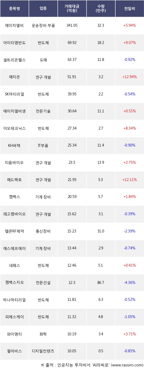 기관 투자자의 순매도 상위 20개 종목은 에이치엘비, 아이티엠반도체, 셀트리온헬스케어, 메지온, SK머티리얼즈, 에이치엘비생명과학, 이오테크닉스, KH바텍, 티움바이오, 메드팩토등이다.