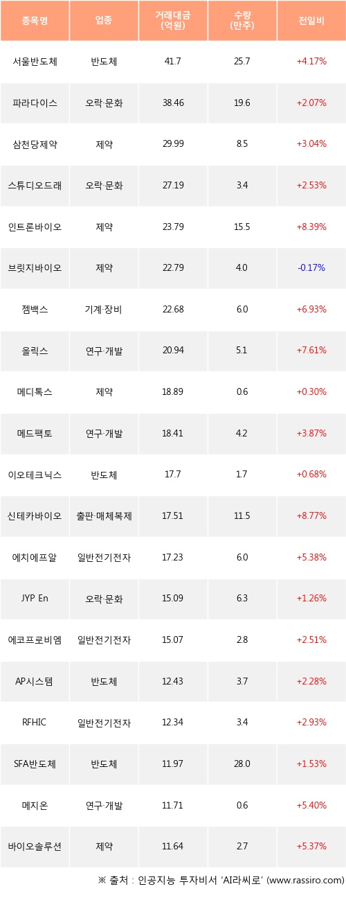 서울반도체, 파라다이스, 삼천당제약 등은 전일 대비 주가가 상승했고, 브릿지바이오테라퓨틱스 등은 주가가 하락했다.
