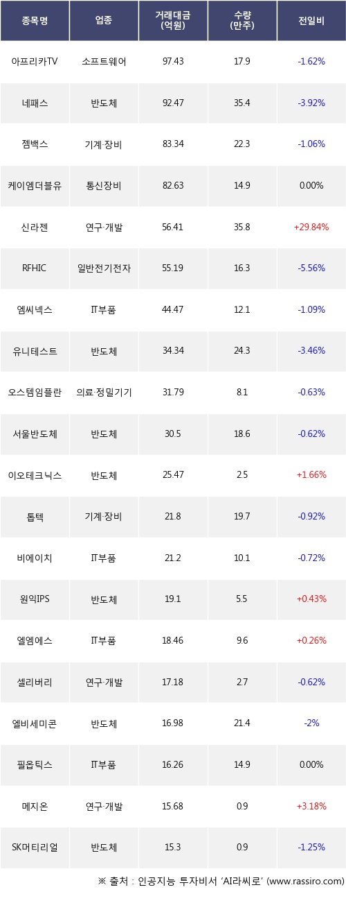 신라젠, 이오테크닉스, 원익IPS 등은 전일 대비 주가가 상승했고, 아프리카TV, 네패스, 젬백스 등은 주가가 하락했다.