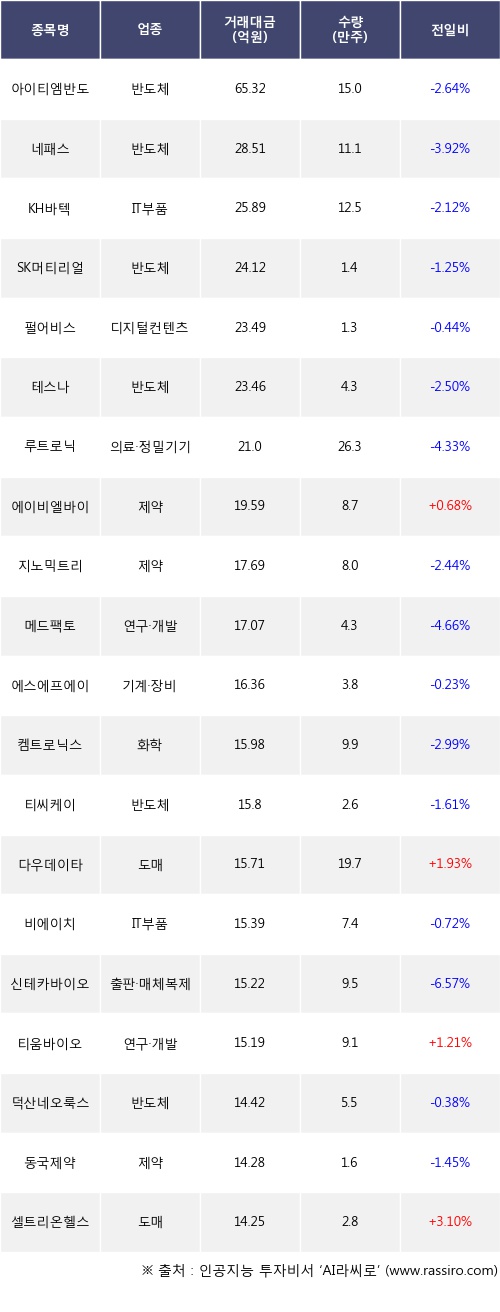기관 투자자의 순매도 상위 20개 종목은 아이티엠반도체, 네패스, KH바텍, SK머티리얼즈, 펄어비스, 테스나, 루트로닉, 에이비엘바이오, 지노믹트리, 메드팩토등이다.