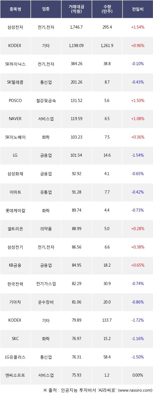 삼성전자, KODEX 200TR, POSCO 등은 전일 대비 주가가 상승했고, SK하이닉스, SK텔레콤, LG 등은 주가가 하락했다.