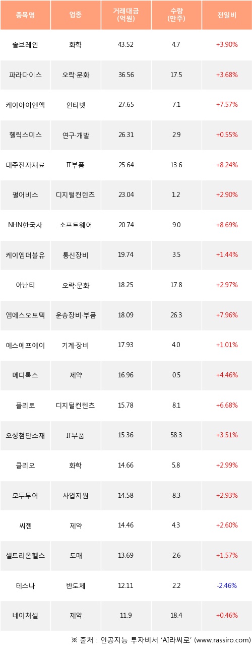 솔브레인, 파라다이스, 케이아이엔엑스 등은 전일 대비 주가가 상승했고, 테스나 등은 주가가 하락했다.