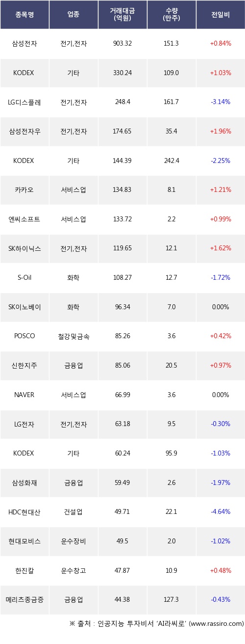 삼성전자, KODEX 200, 삼성전자우 등은 전일 대비 주가가 상승했고, LG디스플레이, KODEX 200선물인버스2X, S-Oil 등은 주가가 하락했다.