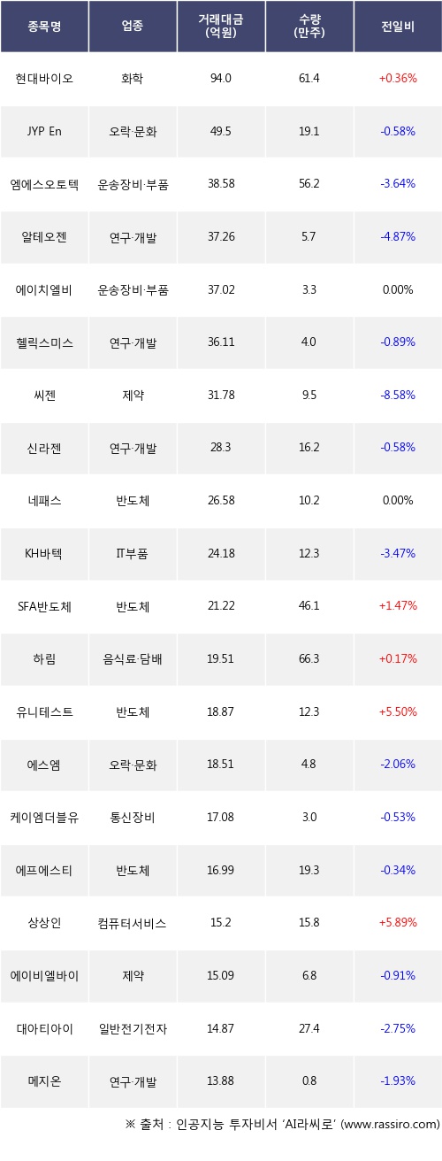 현대바이오, SFA반도체, 하림 등은 전일 대비 주가가 상승했고, JYP Ent., 엠에스오토텍, 알테오젠 등은 주가가 하락했다.