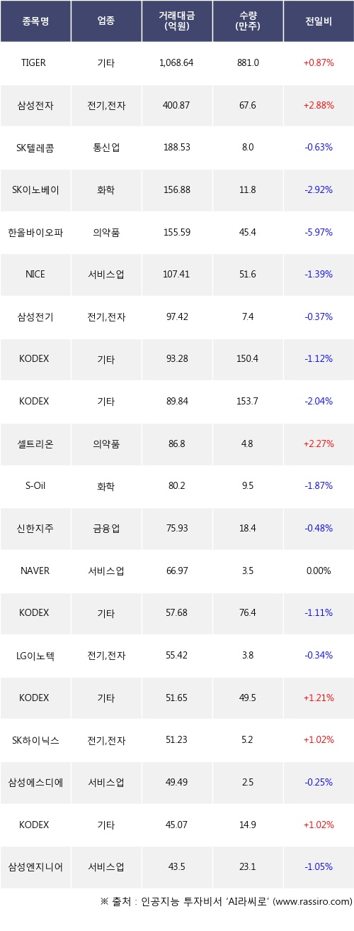 TIGER MSCI Korea TR, 삼성전자, 셀트리온 등은 전일 대비 주가가 상승했고, SK텔레콤, SK이노베이션, 한올바이오파마 등은 주가가 하락했다.