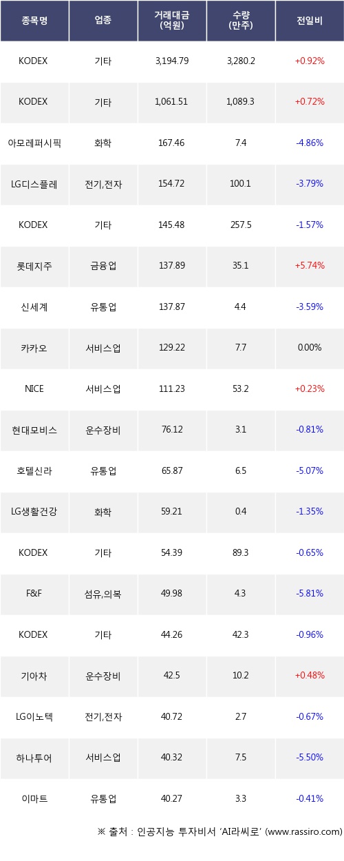 KODEX MSCI Korea TR, KODEX 200TR, 롯데지주 등은 전일 대비 주가가 상승했고, 아모레퍼시픽, LG디스플레이, KODEX 200선물인버스2X 등은 주가가 하락했다.