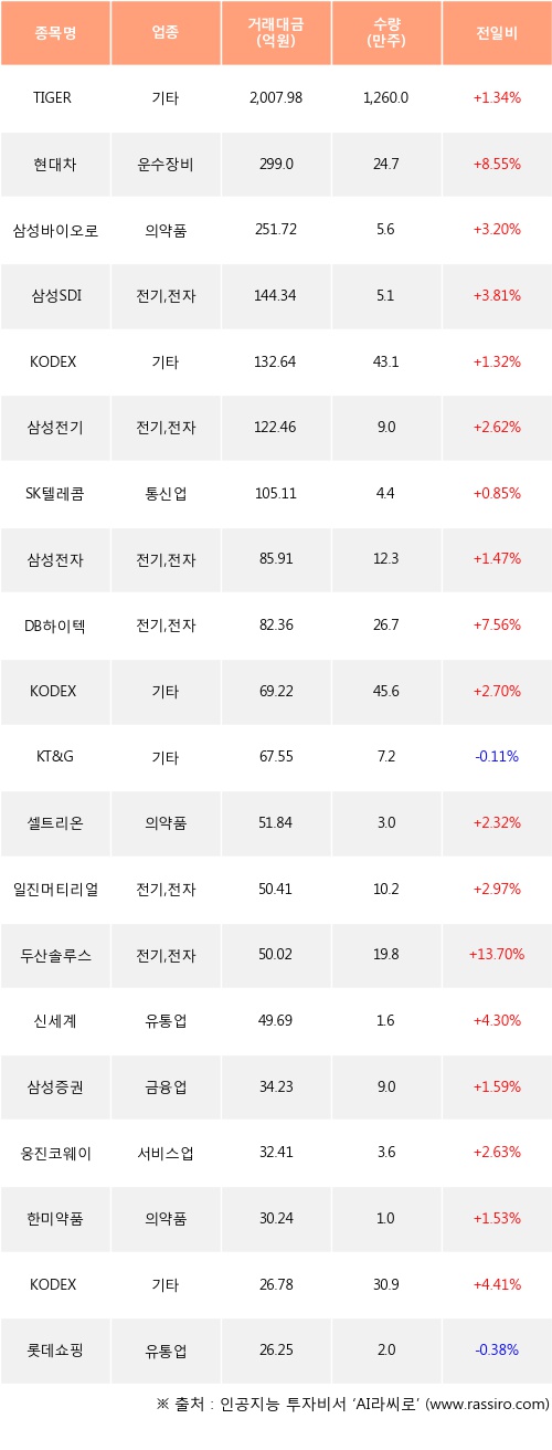 외국인 투자자의 순매수 상위 20개 종목은 TIGER 200TR, 현대차, 삼성바이오로직스, 삼성SDI, KODEX 200, 삼성전기, SK텔레콤, 삼성전자, DB하이텍, KODEX 레버리지등이다.