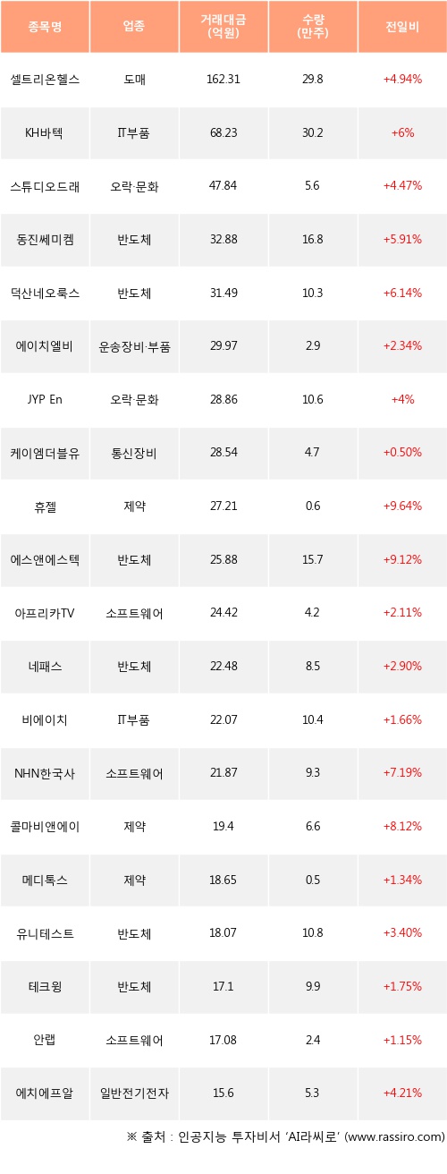 이날 기관 투자자가 순매수한 종목들 중에 셀트리온헬스케어, KH바텍, 스튜디오드래곤 등은 전일 대비 주가가 상승했다.