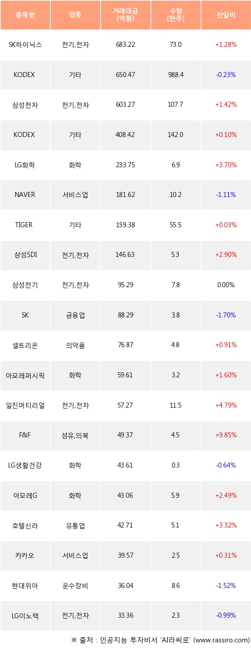 SK하이닉스, 삼성전자, KODEX 200 등은 전일 대비 주가가 상승했고, KODEX 200선물인버스2X, NAVER, SK 등은 주가가 하락했다.
