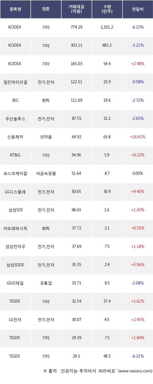 KODEX 200, 신풍제약, KT&G 등은 전일 대비 주가가 상승했고, KODEX 200선물인버스2X, KODEX 인버스, 일진머티리얼즈 등은 주가가 하락했다.