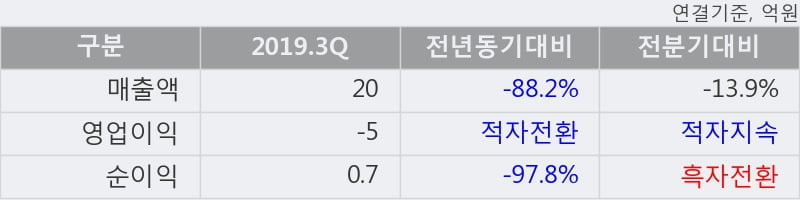 - 2019.3Q, 매출액 20억(-88.2%), 영업이익 -5억(적자전환)