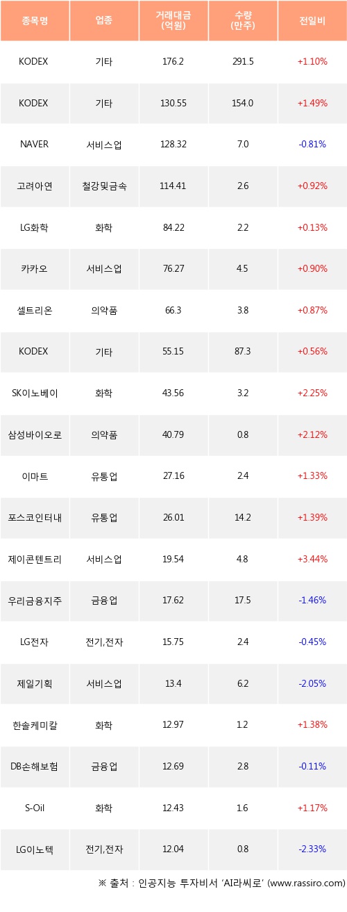 KODEX 200선물인버스2X, KODEX 코스닥150 레버리지, 고려아연 등은 전일 대비 주가가 상승했고, NAVER, 우리금융지주, LG전자 등은 주가가 하락했다.
