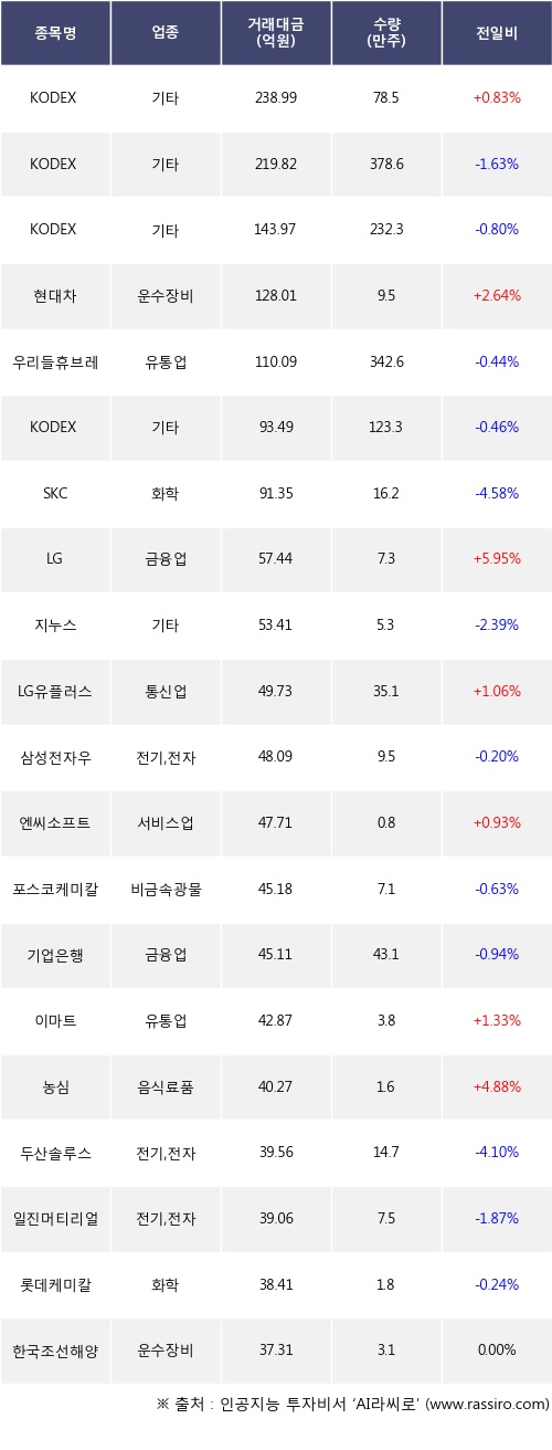 KODEX 200, 현대차, LG 등은 전일 대비 주가가 상승했고, KODEX 200선물인버스2X, KODEX 인버스, 우리들휴브레인 등은 주가가 하락했다.