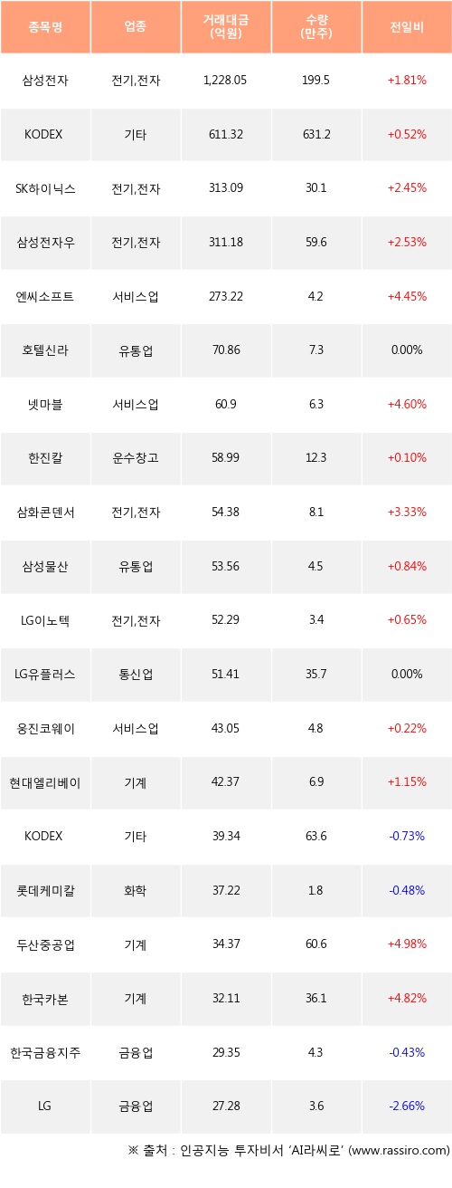 외국인 투자자의 순매수 상위 20개 종목은 삼성전자, KODEX 200TR, SK하이닉스, 삼성전자우, 엔씨소프트, 호텔신라, 넷마블, 한진칼, 삼화콘덴서, 삼성물산등이다.