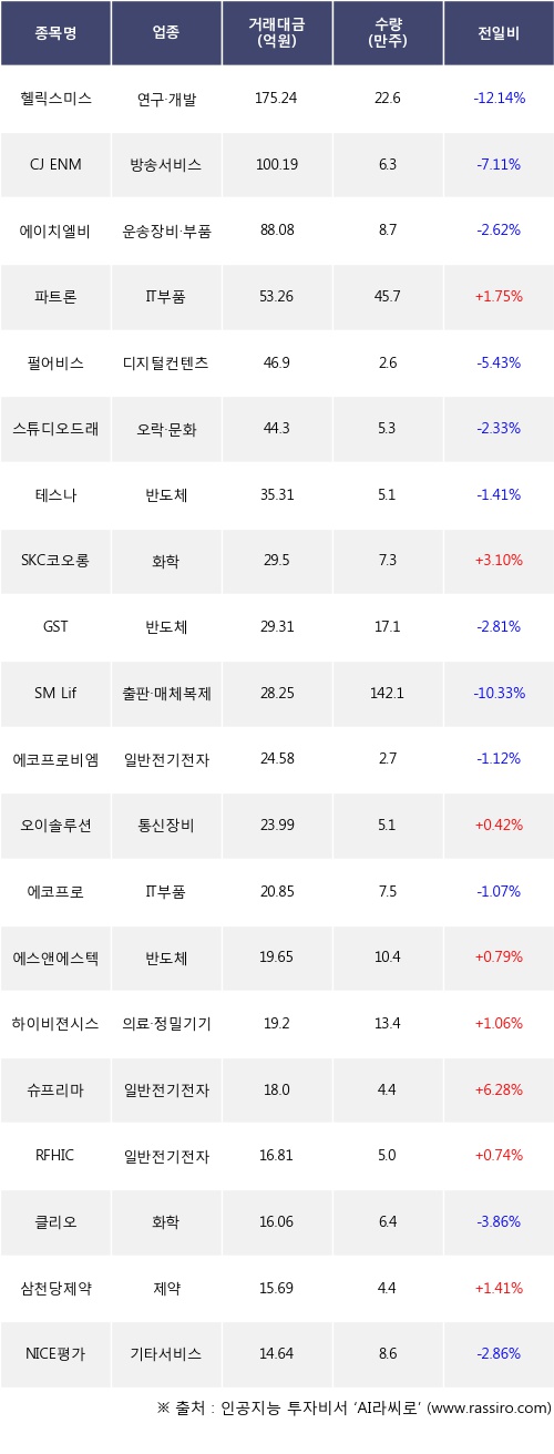 외국인 투자자의 순매도 상위 20개 종목은 헬릭스미스, CJ ENM, 에이치엘비, 파트론, 펄어비스, 스튜디오드래곤, 테스나, SKC코오롱PI, GST, SM Life Design등이다.