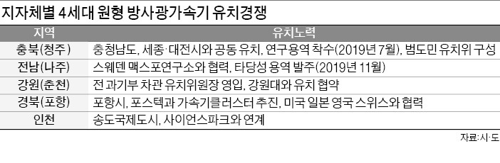 강원도는 춘천시, 강원대와 함께 유치활동을 벌이고 있다. 춘천시는 4세대 원형 방사광가속기를 홍천 메디컬연구단지, 원주 의료기기산업과 연계해 지역 발전을 이끌어가기로 했다. 최문순 강원지사는 “바이오, 의료기기 등 강원 전략산업과 연계해 중부권 최대 과학산업단지로 도약할 수 있는 기회”라고 말했다.
