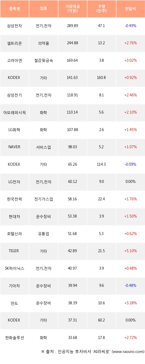 셀트리온, 고려아연, KODEX 코스닥150 레버리지 등은 전일 대비 주가가 상승했고, 삼성전자, KODEX 200선물인버스2X, 기아차 등은 주가가 하락했다.
