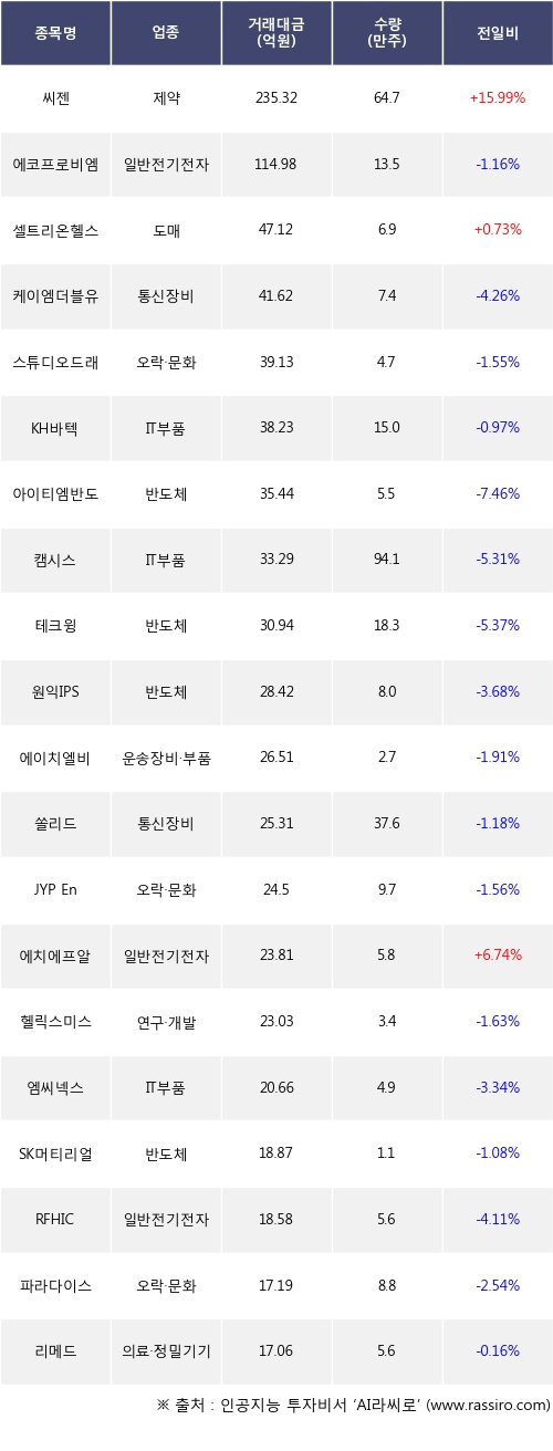 기관 투자자의 순매도 상위 20개 종목은 씨젠, 에코프로비엠, 셀트리온헬스케어, 케이엠더블유, 스튜디오드래곤, KH바텍, 아이티엠반도체, 캠시스, 테크윙, 원익IPS등이다.