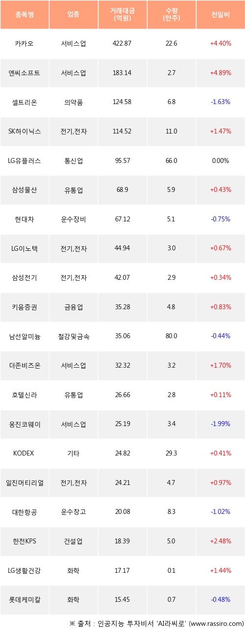 외국인 투자자의 순매수 상위 20개 종목은 카카오, 엔씨소프트, 셀트리온, SK하이닉스, LG유플러스, 삼성물산, 현대차, LG이노텍, 삼성전기, 키움증권등이다.