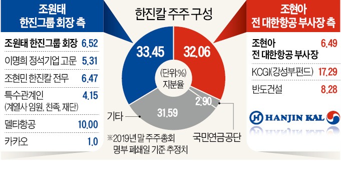 다음달 열리는 한진칼 정기 주총은 국민연금과 국내외 기관투자가, 소액주주 등의 표심에 따라 승부가 갈릴 수밖에 없다. 경영권 분쟁을 벌이고 있는 조 회장 측과 ‘반(反) 조원태 3자 연합(조 전 부사장, KCGI, 반도건설)’의 지분이 엇비슷한 상황이기 때문이다.