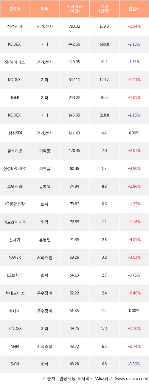 삼성전자, KODEX 200, TIGER 200 등은 전일 대비 주가가 상승했고, KODEX 200선물인버스2X, SK하이닉스, KODEX 인버스 등은 주가가 하락했다.