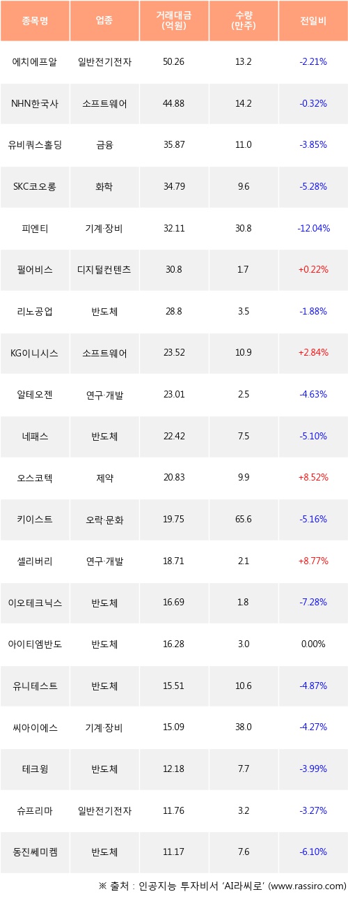 외국인 투자자의 순매수 상위 20개 종목은 에치에프알, NHN한국사이버결제, 유비쿼스홀딩스, SKC코오롱PI, 피엔티, 펄어비스, 리노공업, KG이니시스, 알테오젠, 네패스등이다.