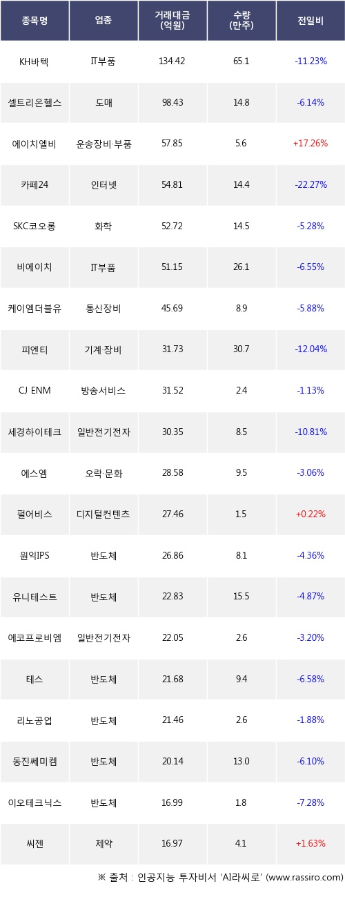 기관 투자자의 순매도 상위 20개 종목은 KH바텍, 셀트리온헬스케어, 에이치엘비, 카페24, SKC코오롱PI, 비에이치, 케이엠더블유, 피엔티, CJ ENM, 세경하이테크등이다.
