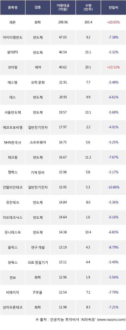 기관 투자자의 순매도 상위 20개 종목은 레몬, 아이티엠반도체, 원익IPS, 코미팜, 에스엠, 테스, 서울반도체, 에코프로비엠, NHN한국사이버결제, 테크윙등이다.