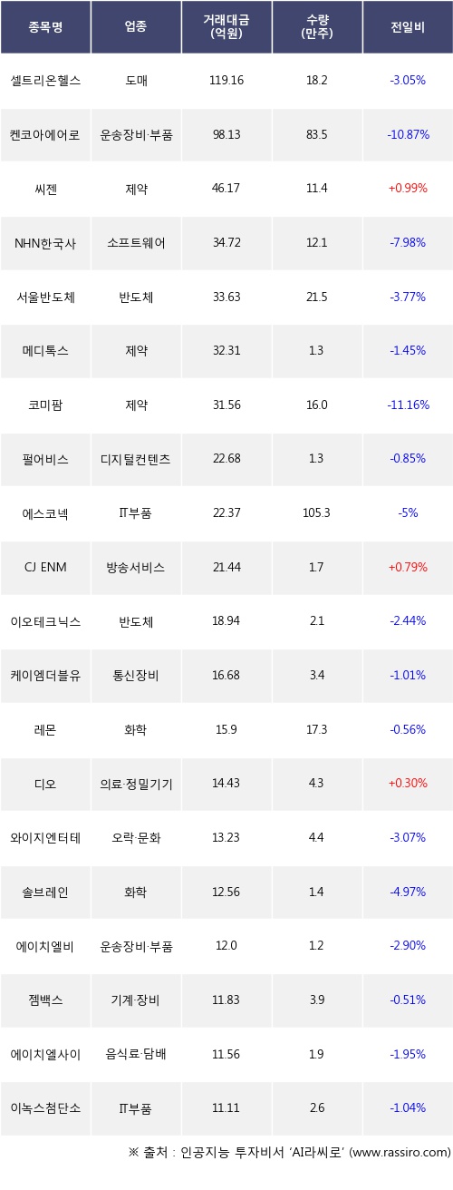 기관 투자자의 순매도 상위 20개 종목은 셀트리온헬스케어, 켄코아에어로스페이스, 씨젠, NHN한국사이버결제, 서울반도체, 메디톡스, 코미팜, 펄어비스, 에스코넥, CJ ENM등이다.
