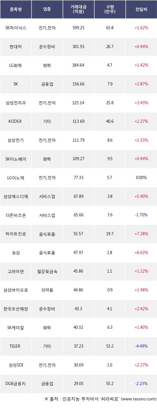 SK하이닉스, 현대차, LG화학 등은 전일 대비 주가가 상승했고, 더존비즈온, TIGER 200선물인버스2X, DGB금융지주 등은 주가가 하락했다.