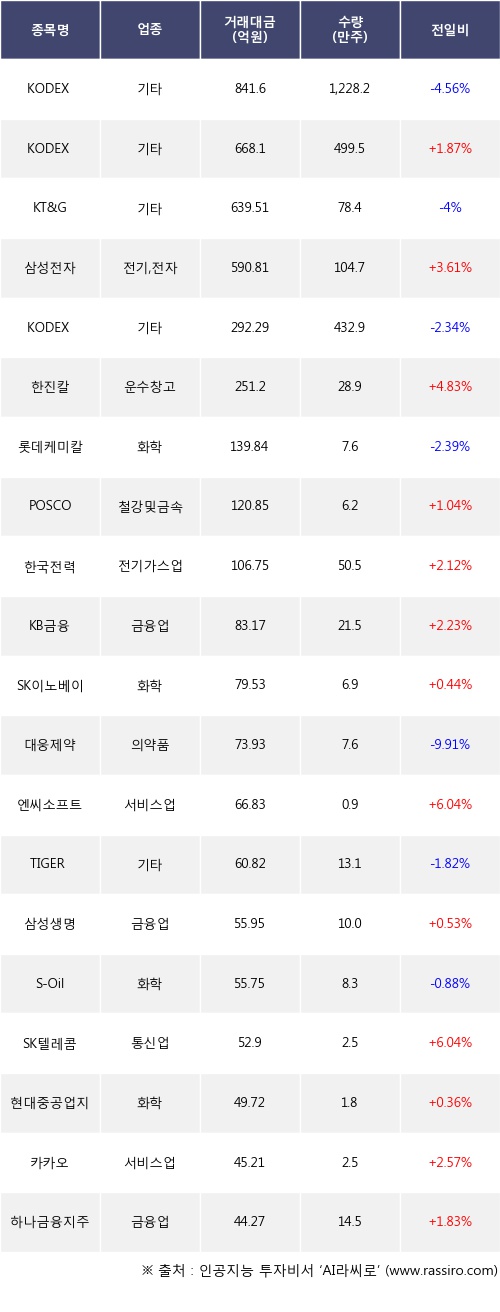 KODEX Top5PlusTR, 삼성전자, 한진칼 등은 전일 대비 주가가 상승했고, KODEX 200선물인버스2X, KT&G, KODEX 인버스 등은 주가가 하락했다.