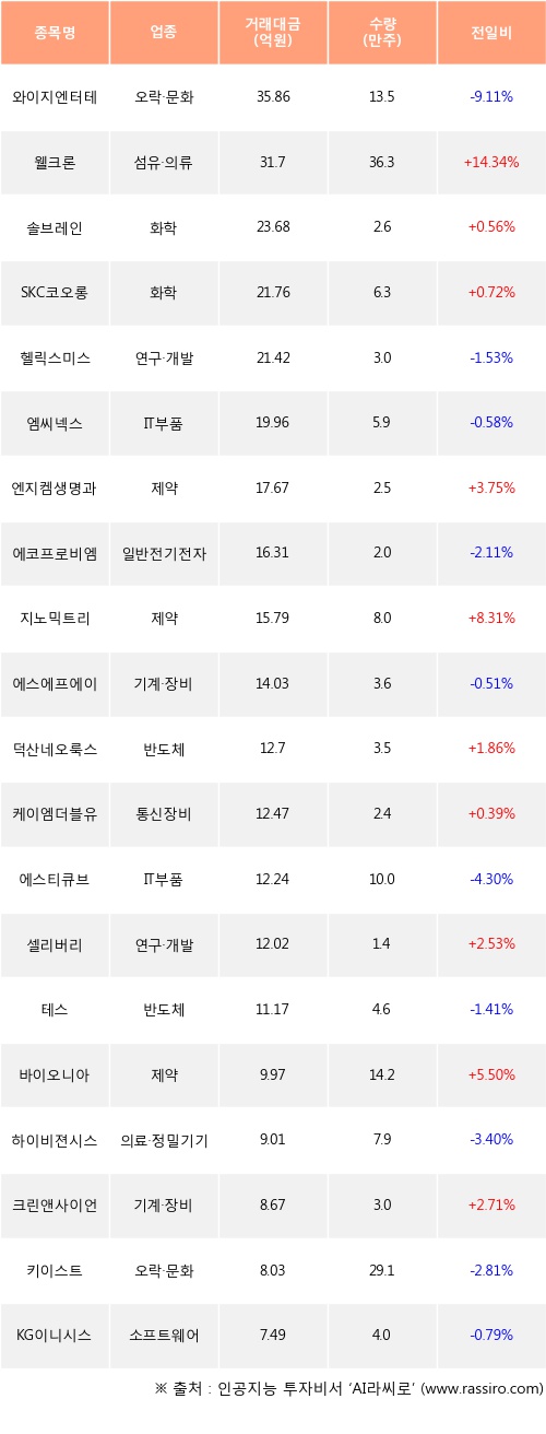 웰크론, 솔브레인, SKC코오롱PI 등은 전일 대비 주가가 상승했고, 와이지엔터테인먼트, 헬릭스미스, 엠씨넥스 등은 주가가 하락했다.