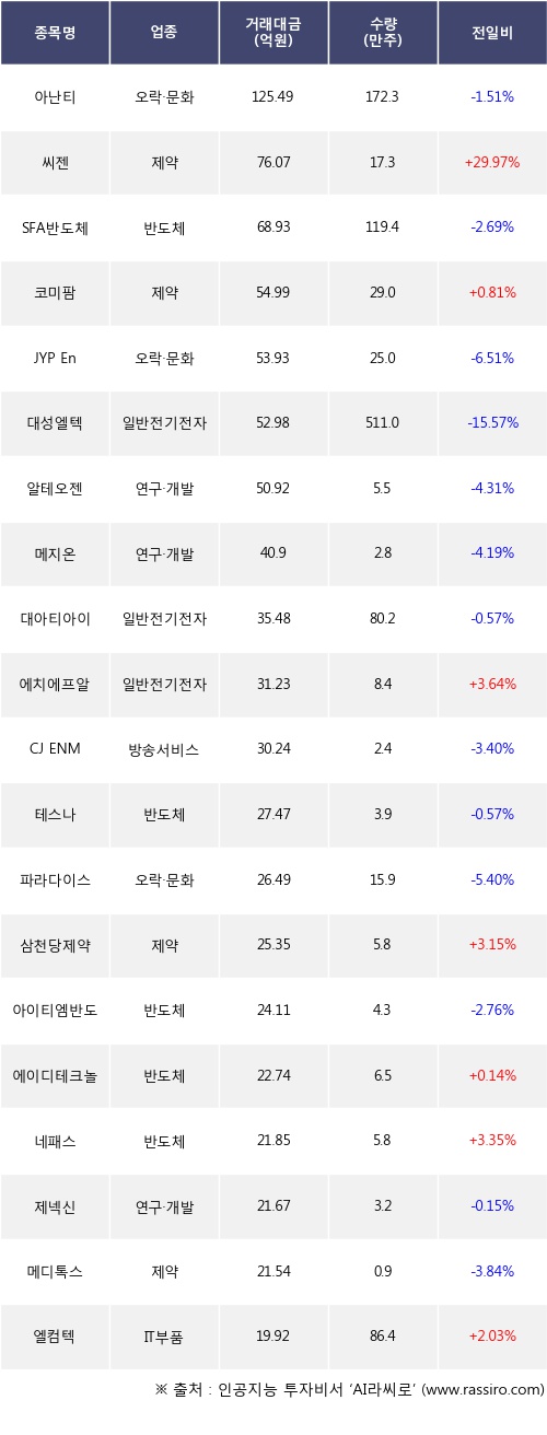 씨젠, 코미팜, 에치에프알 등은 전일 대비 주가가 상승했고, 아난티, SFA반도체, JYP Ent. 등은 주가가 하락했다.
