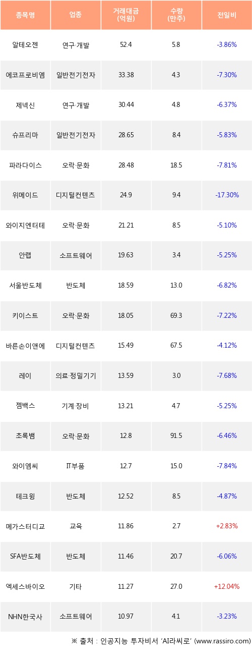외국인 투자자의 순매수 상위 20개 종목은 알테오젠, 에코프로비엠, 제넥신, 슈프리마, 파라다이스, 위메이드, 와이지엔터테인먼트, 안랩, 서울반도체, 키이스트등이다.