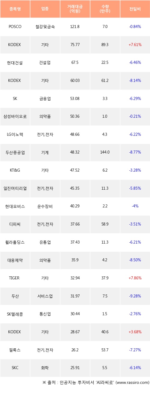 KODEX 200선물인버스2X, TIGER 200선물인버스2X, KODEX 인버스 등은 전일 대비 주가가 상승했고, POSCO, 현대건설, KODEX 레버리지 등은 주가가 하락했다.