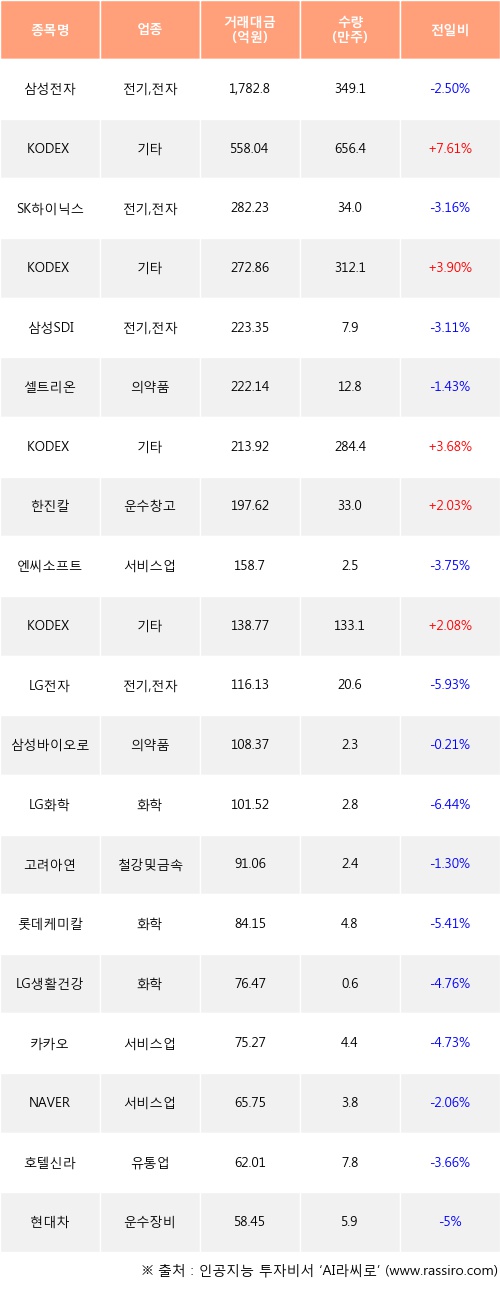 KODEX 200선물인버스2X, KODEX 코스닥150선물인버스, KODEX 인버스 등은 전일 대비 주가가 상승했고, 삼성전자, SK하이닉스, 삼성SDI 등은 주가가 하락했다.