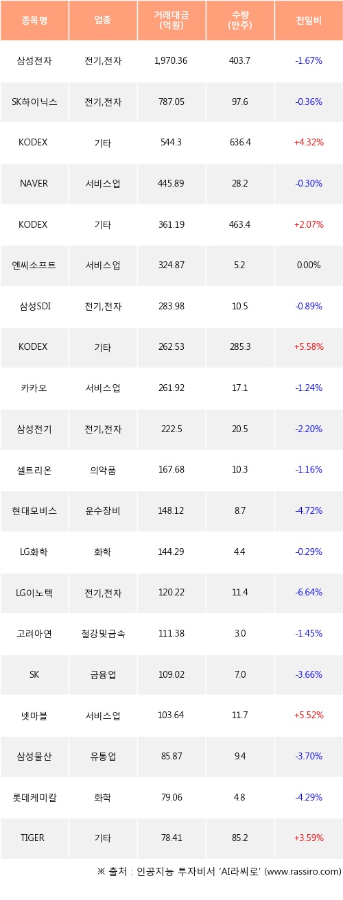 KODEX 200선물인버스2X, KODEX 인버스, KODEX 코스닥150선물인버스 등은 전일 대비 주가가 상승했고, 삼성전자, SK하이닉스, NAVER 등은 주가가 하락했다.