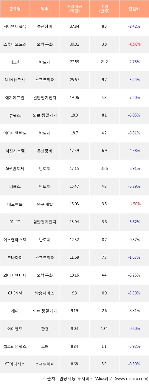 기관 투자자의 순매수 상위 20개 종목은 케이엠더블유, 스튜디오드래곤, 테크윙, NHN한국사이버결제, 에치에프알, 뷰웍스, 아이티엠반도체, 서진시스템, SFA반도체, 네패스등이다.