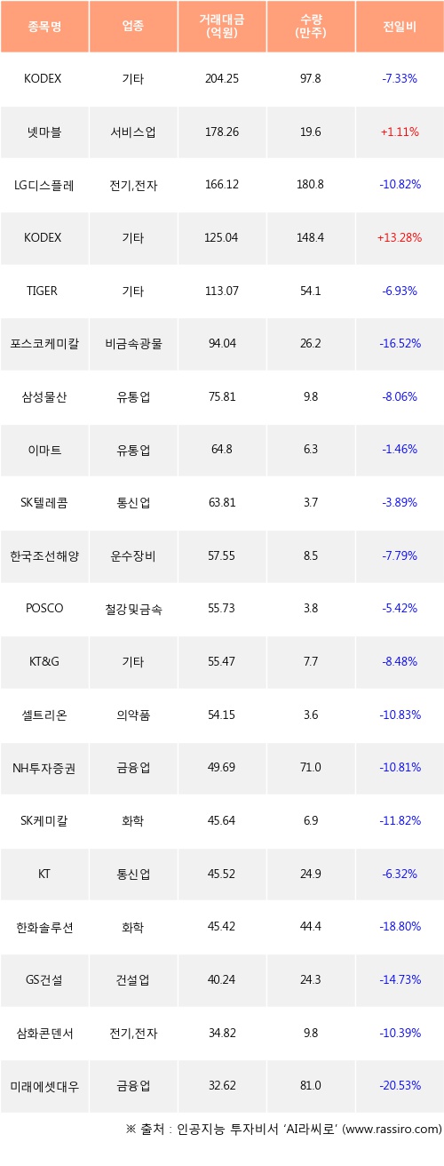 넷마블, KODEX 200선물인버스2X 등은 전일 대비 주가가 상승했고, KODEX 200, LG디스플레이, TIGER 200 등은 주가가 하락했다.