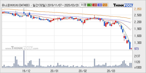 일봉 차트의 모습은 단기·중기 역배열 구간에서 하락세가 이어지다가 오늘 반등의 모습을 보여주고 있다.