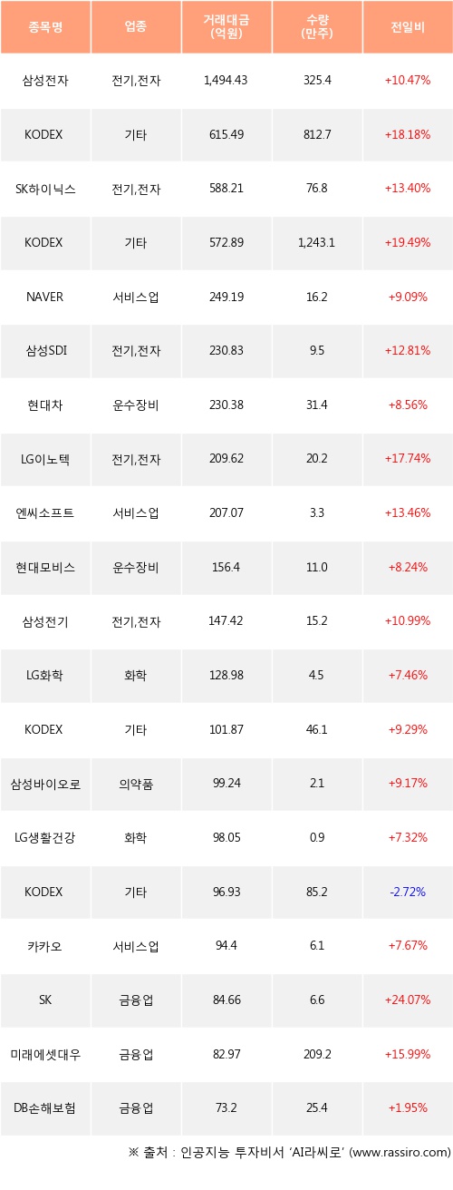 삼성전자, KODEX 레버리지, SK하이닉스 등은 전일 대비 주가가 상승했고, KODEX 미국달러선물레버리지 등은 주가가 하락했다.