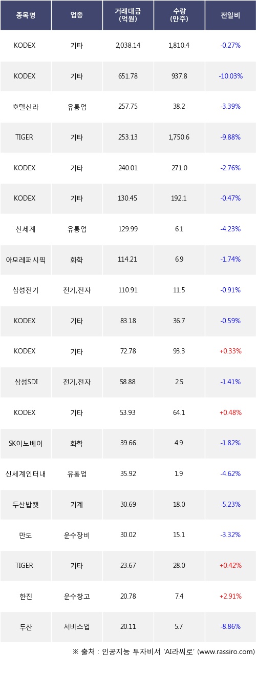 KODEX 인버스, KODEX 200선물인버스2X, TIGER 인버스 등은 전일 대비 주가가 상승했고, KODEX Top5PlusTR, KODEX WTI원유선물(H), 호텔신라 등은 주가가 하락했다.