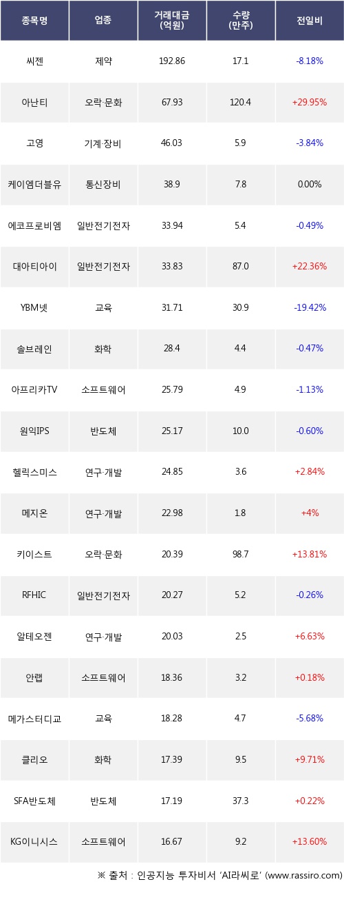 외국인 투자자의 순매도 상위 20개 종목은 씨젠, 아난티, 고영, 케이엠더블유, 에코프로비엠, 대아티아이, YBM넷, 솔브레인, 아프리카TV, 원익IPS등이다.