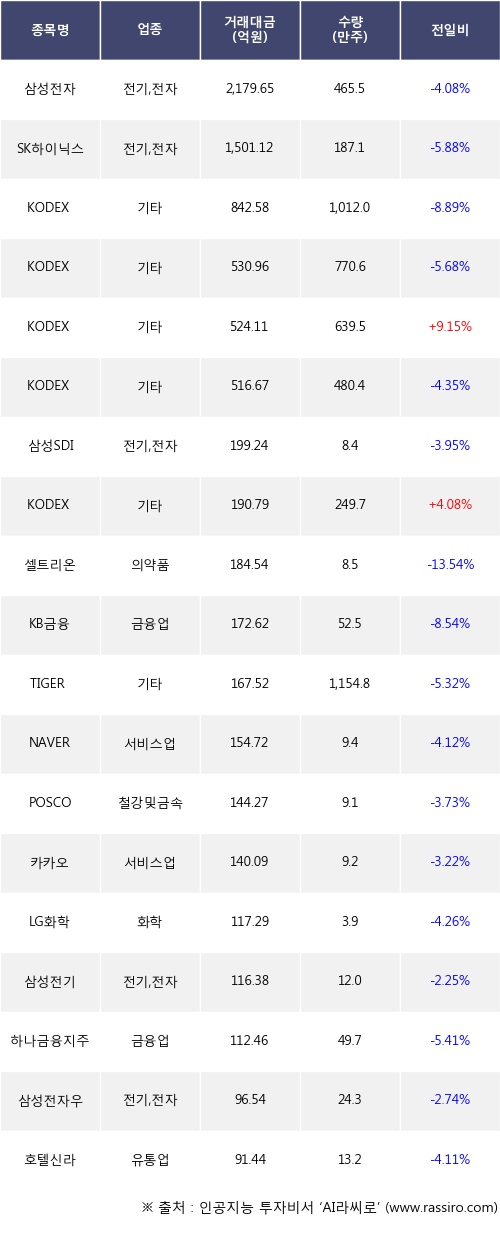 기관 투자자의 순매도 상위 20개 종목은 삼성전자, SK하이닉스, KODEX 레버리지, KODEX WTI원유선물(H), KODEX 200선물인버스2X, KODEX Top5PlusTR, 삼성 레버리지 WTI원유 선물 ETN, 삼성SDI, KODEX 코스닥150선물인버스, 셀트리온등이다.