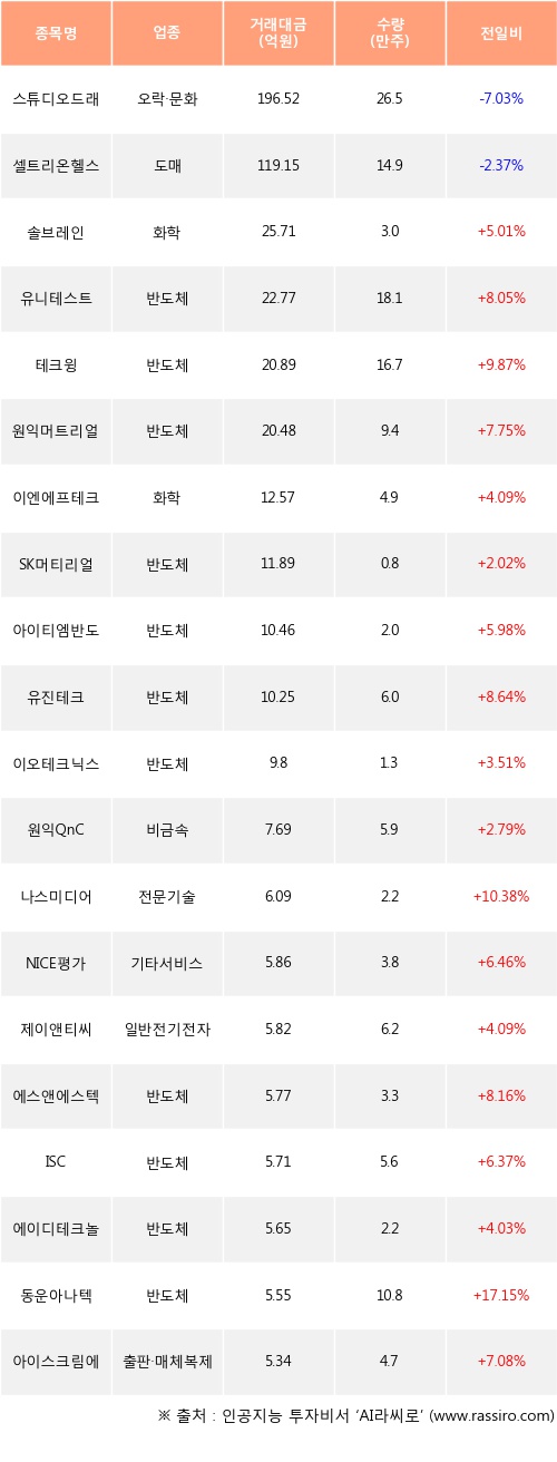 솔브레인, 유니테스트, 테크윙 등은 전일 대비 주가가 상승했고, 스튜디오드래곤, 셀트리온헬스케어 등은 주가가 하락했다.