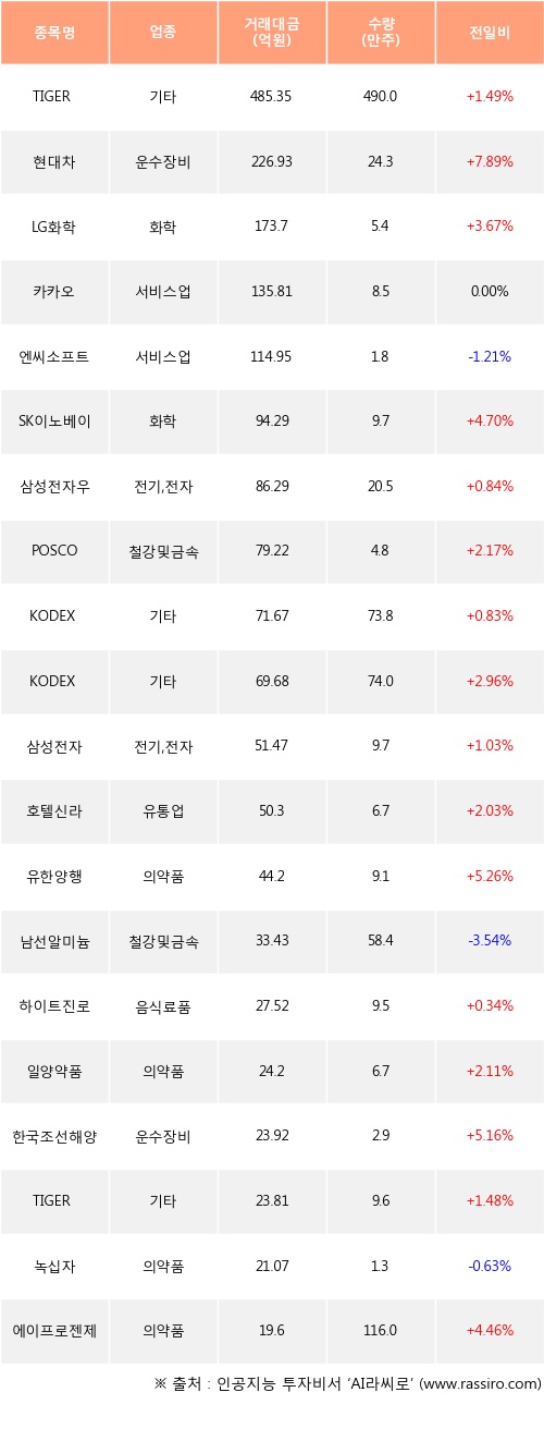 외국인 투자자의 순매수 상위 20개 종목은 TIGER MSCI Korea TR, 현대차, LG화학, 카카오, 엔씨소프트, SK이노베이션, 삼성전자우, POSCO, KODEX 코스닥 150, KODEX 레버리지등이다.
