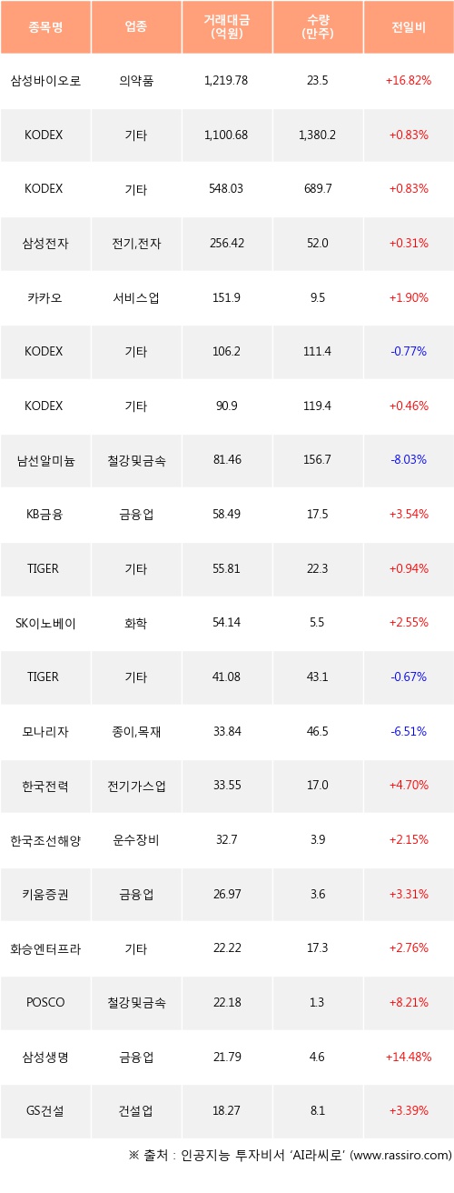 삼성바이오로직스, KODEX MSCI Korea TR, KODEX 200TR 등은 전일 대비 주가가 상승했고, KODEX 코스닥 150, 남선알미늄, TIGER 코스닥150 등은 주가가 하락했다.