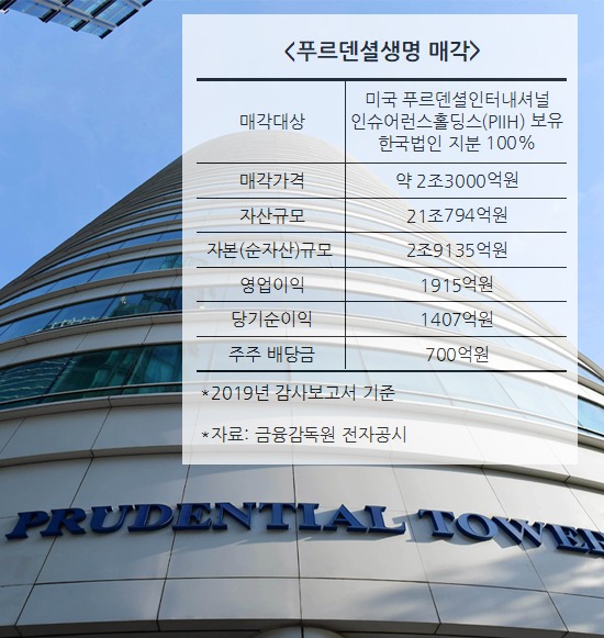 10일 투자은행(IB) 업계에 따르면 푸르덴셜생명 매각주관사 골드만삭스는 이날 KB금융을 푸르덴셜생명 인수자로 선정할 예정이다. KB금융과 미국 푸르덴셜생명은 최종 세부사항을 조율한 뒤 이날 이사회를 열어 매각을 확정할 예정이다. 2조3000억원 안팎의 가격을 제시한 KB금융은 경쟁 사모펀드(PEF)인 MBK파트너스와 한앤컴퍼니를 누르고 푸르덴셜생명을 가져오는 데 성공했다.