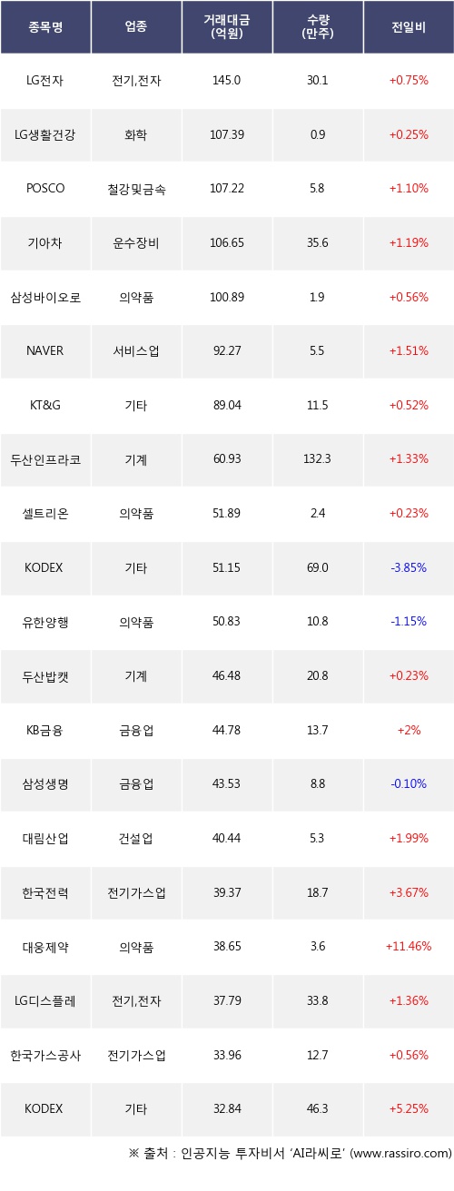 LG전자, LG생활건강, POSCO 등은 전일 대비 주가가 상승했고, KODEX 200선물인버스2X, 유한양행, 삼성생명 등은 주가가 하락했다.
