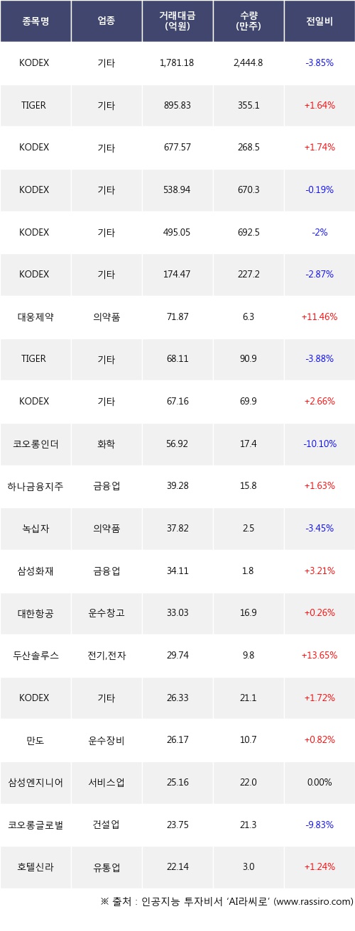 TIGER 200, KODEX 200, 대웅제약 등은 전일 대비 주가가 상승했고, KODEX 200선물인버스2X, KODEX WTI원유선물(H), KODEX 인버스 등은 주가가 하락했다.